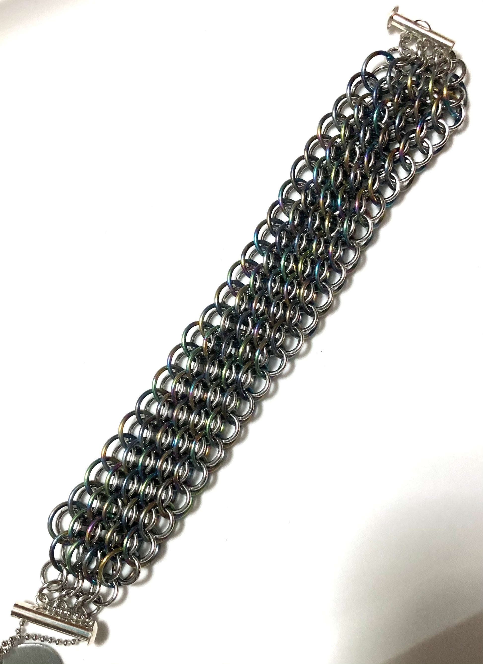 Beautiful rainbow anodized titanium with stainless steel in dragonscale weave on the bias