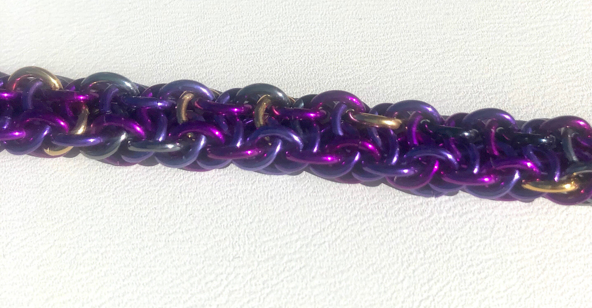 Chainmaille Vipera Berus bracelet made with 18g, 5/32” anodized aluminum rings in shades of purple and a touch of gold!